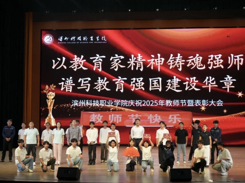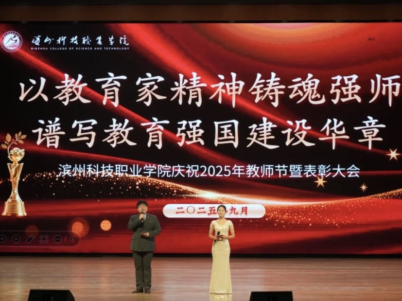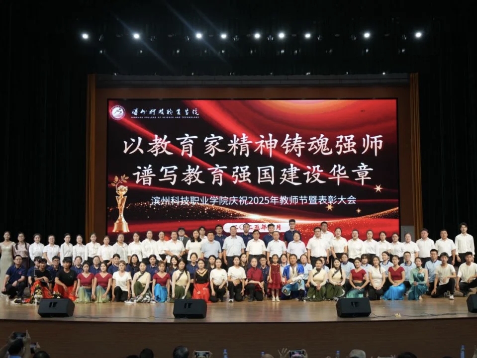 金秋送爽,硕果盈枝。为热烈庆祝第41个教师节,弘扬尊师重道传统,增强全校教职工的荣誉感与幸福感,9月9日,滨州科技职业学院隆重召开庆祝第41个教师节暨表彰大会。学校领导班子出席会议,中层干部、全体教职工及各二级学院学生代表参加会议。会议由党委书记韩锋主持。