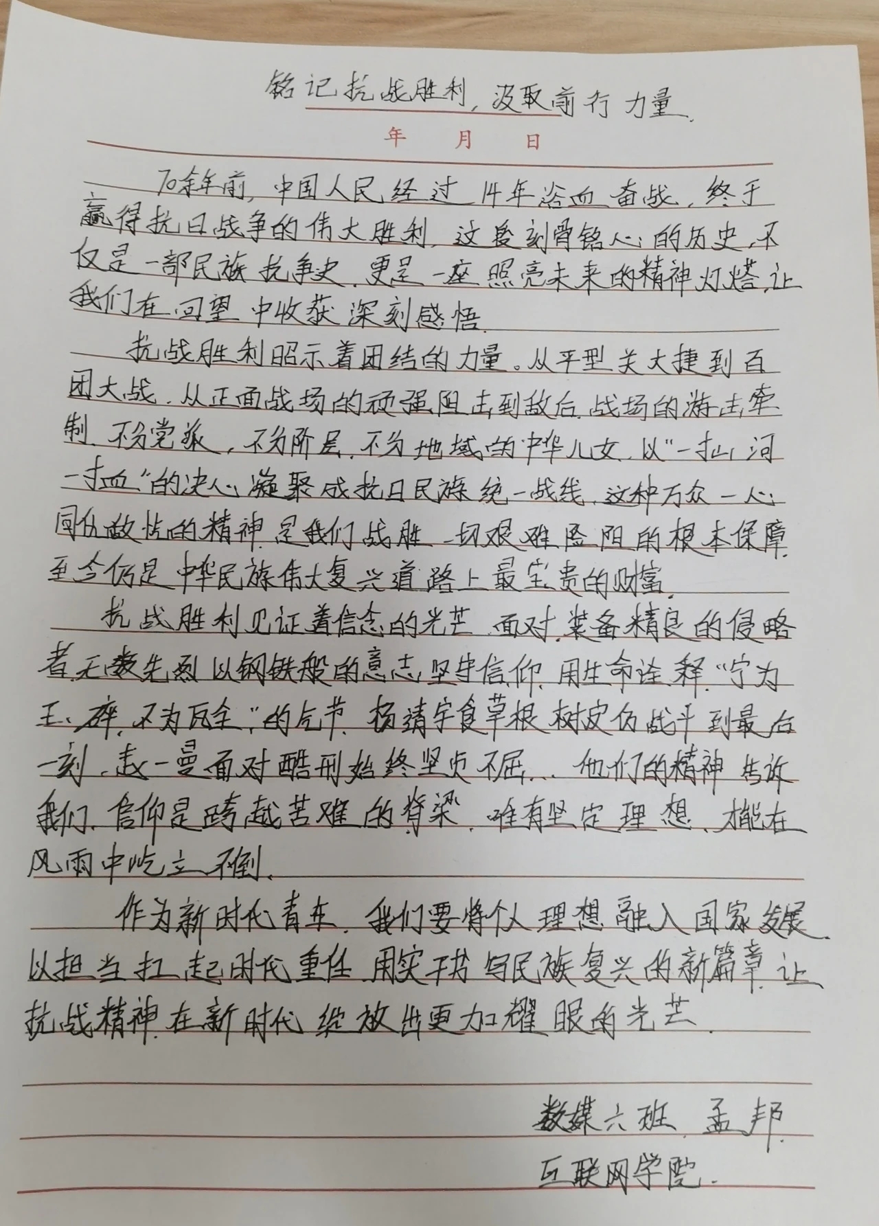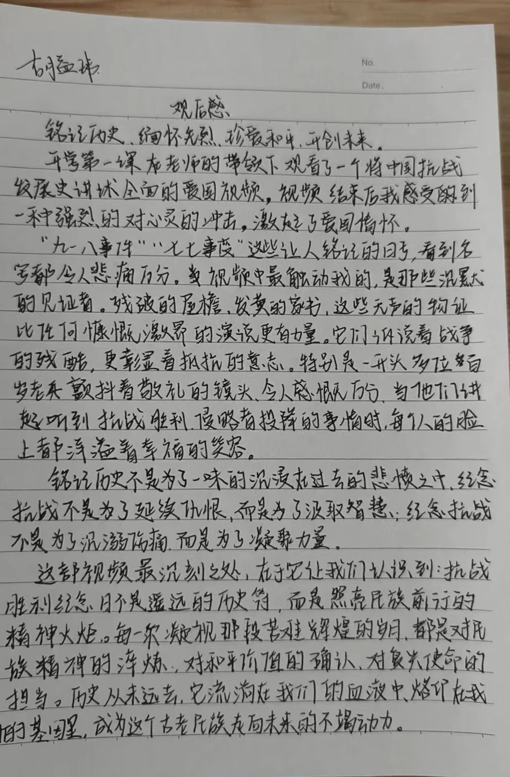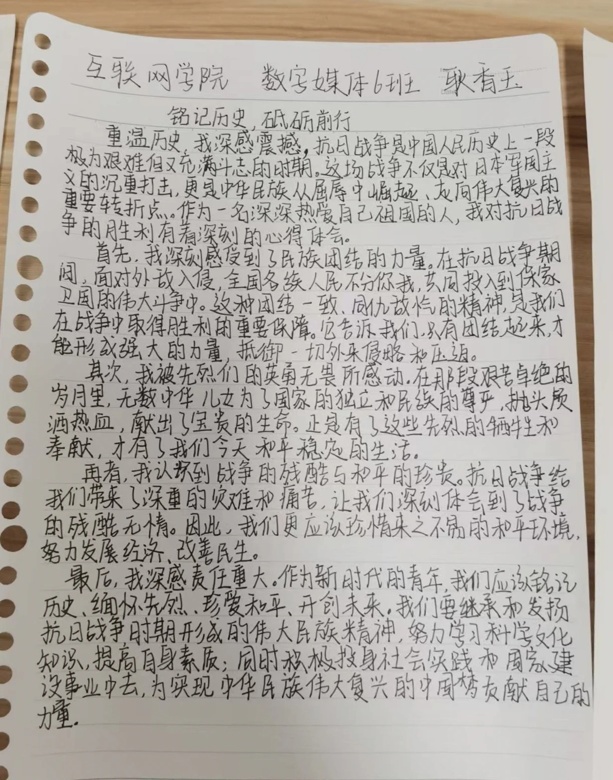 在聆听系列主题授课之余,广大学子深受触动,纷纷提笔,记录下自己的学习体会与思想感悟。一段段文字,是青年与历史的对话,是爱国情怀的自然流淌,更是对未来的思考与承诺。