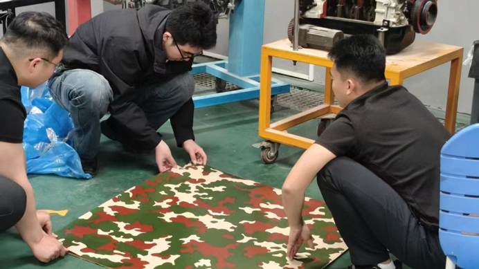模型制作过程中,师生们以专业为笔、以匠心为墨,开启了一场从图纸到实体的匠心之旅。制作现场,师生们分工协作、默契配合:有的手持工具细致切割纸板,精准勾勒模型轮廓;有的凝神聚力拼接部件,反复调整每一处细节的角度与契合度;有的专注粘贴迷彩涂装材料,耐心还原装备的外观质感;有的仔细固定螺丝钉配件,确保结构稳固牢靠。一张张专注的脸庞、一次次严谨的打磨,尽显智能制造学院师生扎实的动手实践能力与严谨细致的专业态度。
