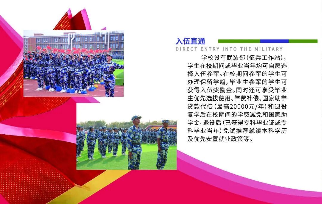 学校设有武装部(征兵工作站),学生在校期间或毕业当年均可自愿选择入伍参军。在校期间参军的学生可办理保留学籍,毕业生参军的学生可获得入伍奖励金。同时还可享受毕业生优先选拔使用、学费补偿、国家助学贷款代偿(最高20000元/年)和退役复学后在校期间的学费减免和国家助学金,退役后(已获得专科毕业证或专科毕业当年)免试推荐就读本科学历及优先安置就业政策等。