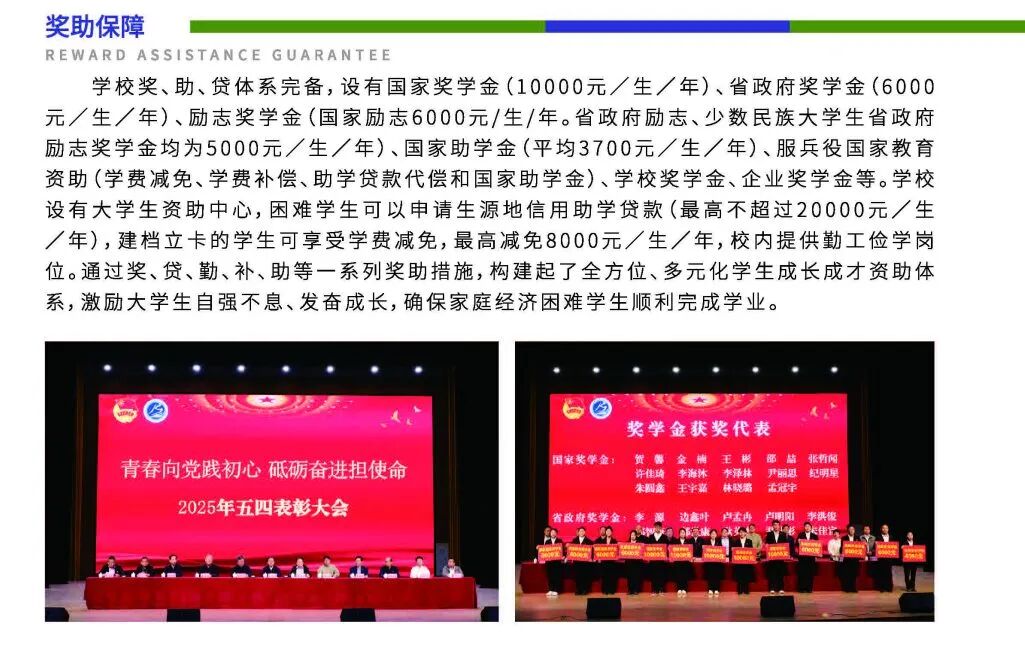 学校奖、助、贷体系完备,设有国家奖学金(10000元/生/年)、省政府奖学金(6000元/生/年)、励志奖学金(国家励志6000元/生/年。省政府励志、少数民族大学生省政府励志奖学金均为5000元/生/年)、国家助学金(平均3700元/生/年)、服兵役国家教育资助(学费减免、学费补偿、助学贷款代偿和国家助学金)、学校奖学金、企业奖学金等。学校设有大学生资助中心,困难学生可以申请生源地信用助学贷款(最高不超过20000元/生/年),建档立卡的学生可享受学费减免,最高减免8000元/生/年,校内提供勤工俭学岗位。通过奖、贷、勤、补、助等一系列奖助措施,构建起了全方位、多元化学生成长成才资助体系,激励大学生自强不息、发奋成长,确保家庭经济困难学生顺利完成学业。