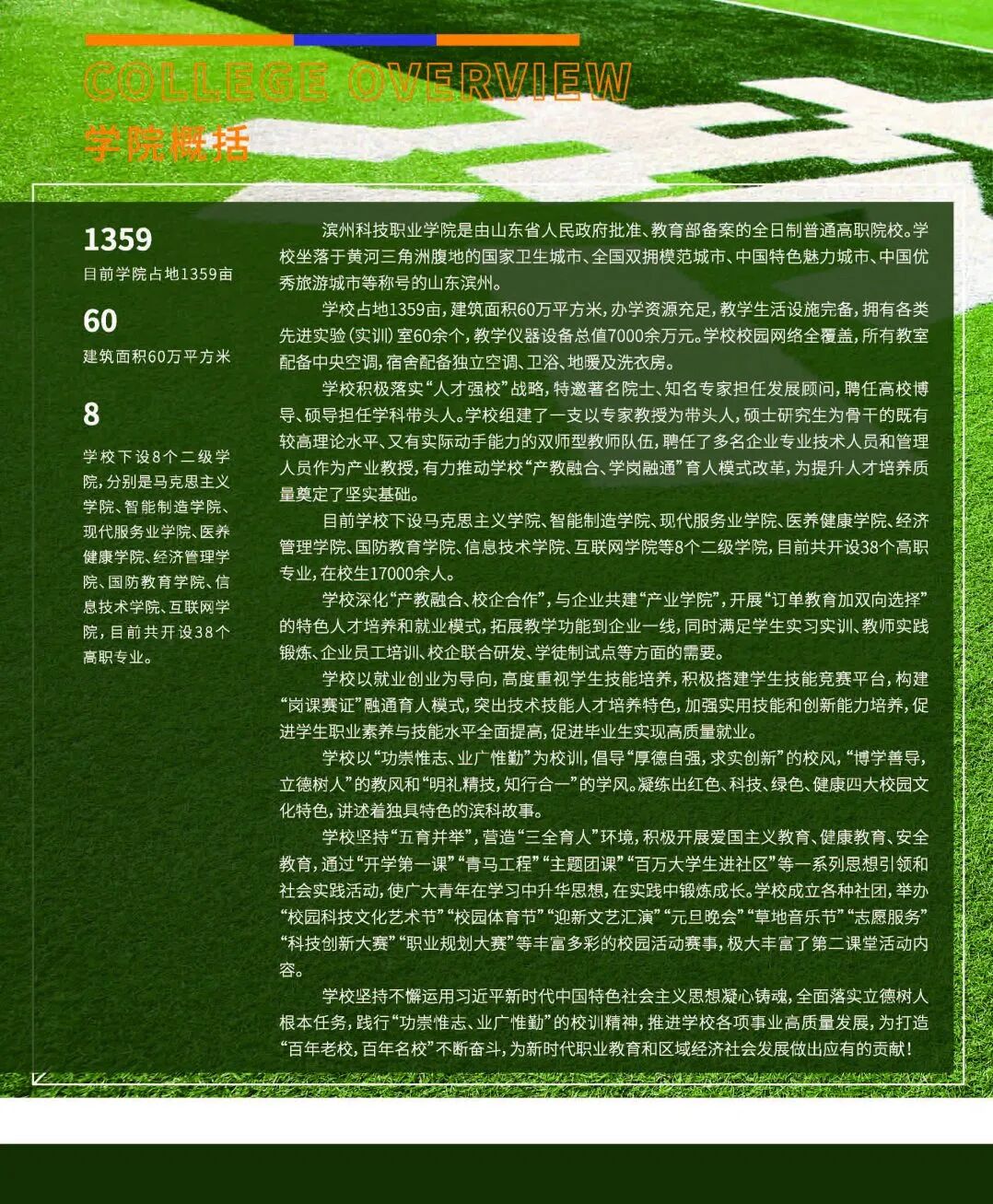 滨州科技职业学院是由山东省人民政府批准、教育部备案的全日制普通高职院校。学校坐落于黄河三角洲腹地的国家卫生城市、全国双拥模范城市、中国特色魅力城市、中国优秀旅游城市等称号的山东滨州,风光秀美,历史悠久,宜居宜业,活力充盈,承载中华文明基因的黄河文化和渤海文化在此交融。