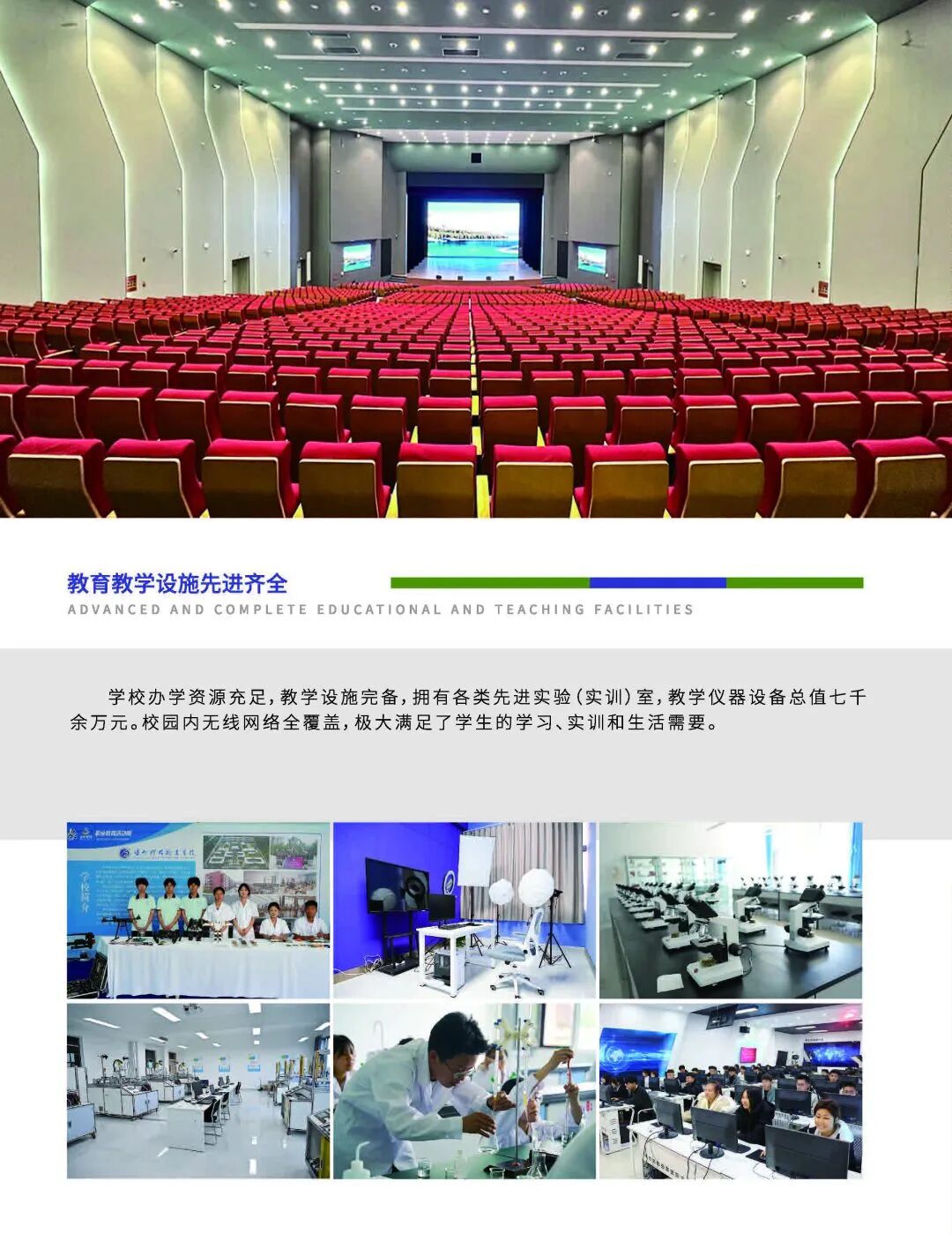 学校办学资源充足,教学设施完备,拥有各类先进实验(实训)室,教学仪器设备总值七千余万元。校园内无线网络全覆盖,极大满足了学生的学习、实训和生活需要。