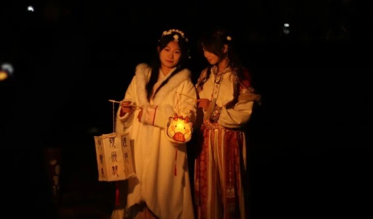 华灯初上,她款步于花灯之间。她身着锦绣汉服,衣袂轻扬,似穿越千年而来。青丝垂落,步摇微晃,于这花灯盛景中,宛如古画里的仙子下凡,轻嗅那花灯下的幽情雅韵,静赏这良辰美景,时光仿佛为之停驻,唯留她与花灯的缱绻私语。