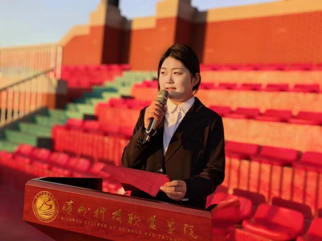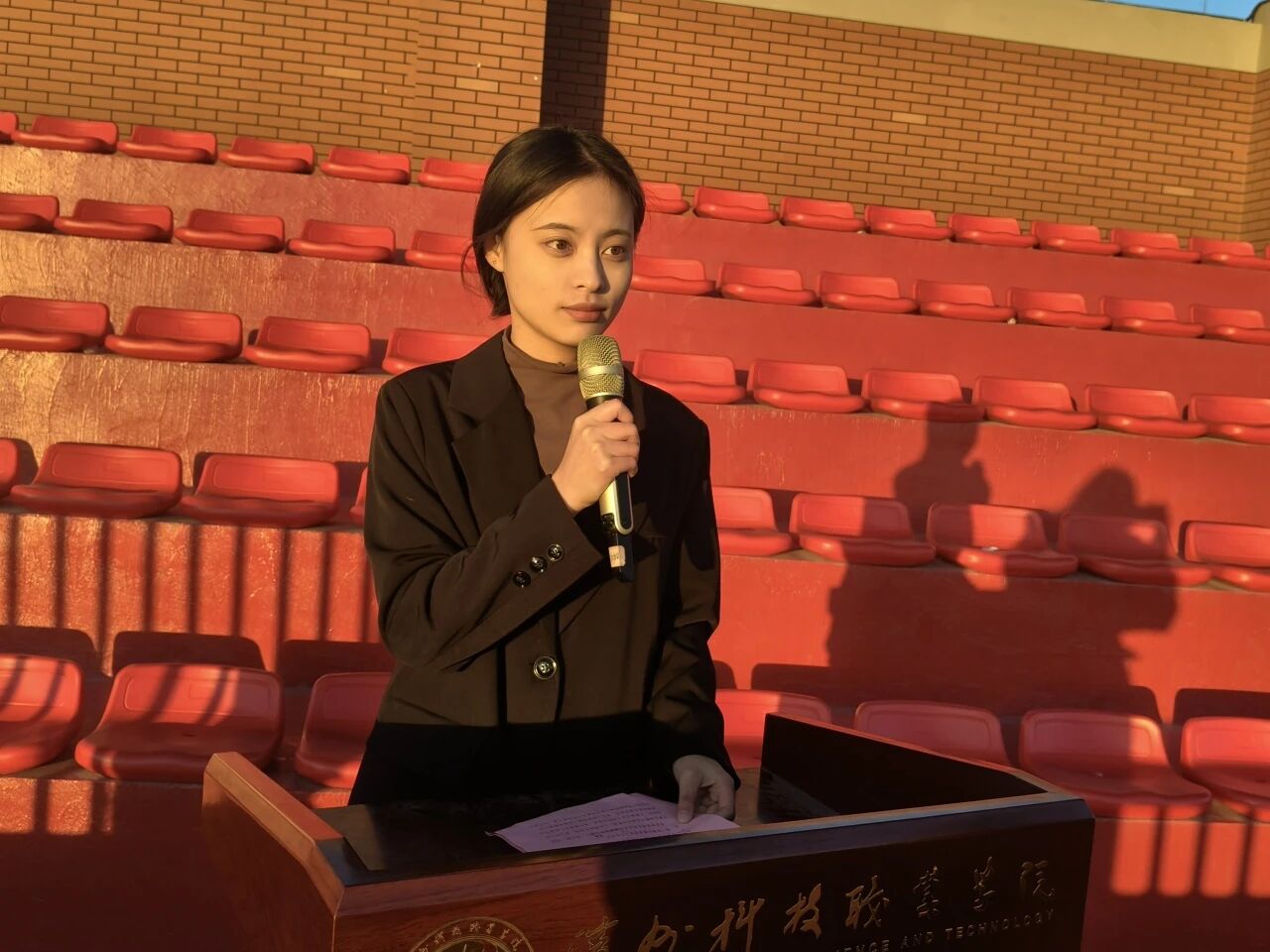 仪式进行第四项,学生干部代表郑诗茹登台发言。她呼吁同学们以实际行动践行爱国精神,努力学习专业知识,提升自己的综合素质,为祖国的未来贡献自己的力量。