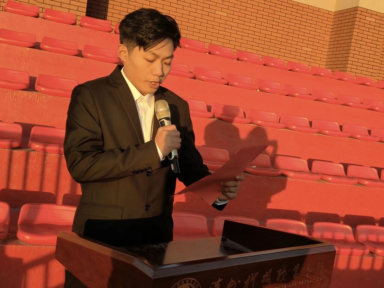 仪式进行第三项,2024级学生代表苏亚博登台发言。以青春的活力和坚定的语气,表达了对祖国的热爱与对未来的憧憬。