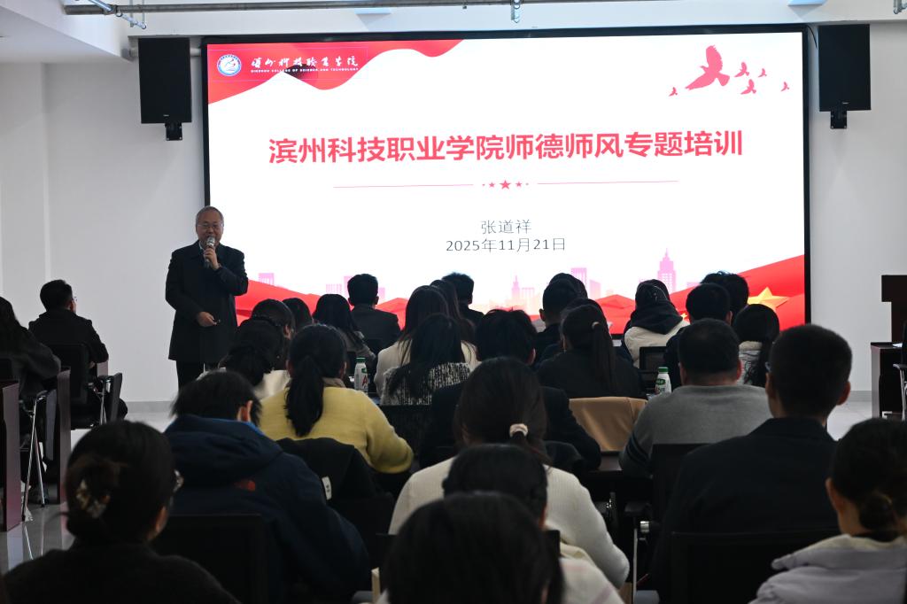 为全面落实新时代教师队伍建设要求,以教育家精神筑牢思想根基,加强新形势下师德师风建设,11月21日,滨州科技职业学院开展师德师风专题培训。培训由现代服务业学院院长张道祥主讲,人事劳资处副处长李倩倩主持,全体青年教师参加培训。