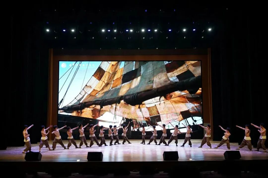 为强化党建引领,大力弘扬黄河文化,助力学校特色品牌建设,6月10日,滨州科技职业学院倾力打造的大型原创舞台剧《黄河号子》成功首演。剧目深度融合思政教育元素,通过“打夯号”“拉蓬号”“摇橹号”三个篇章,生动展现黄河儿女团结拼搏、坚韧不屈的精神风貌。整场演出气势恢宏、情感真挚,将传统非遗艺术与现代舞台艺术有机融合,不仅为校园文化注入新的活力与动能,也进一步强化了师生对黄河文化的情感认同和价值传承,成为学校以文化人、以美育人的生动实践。