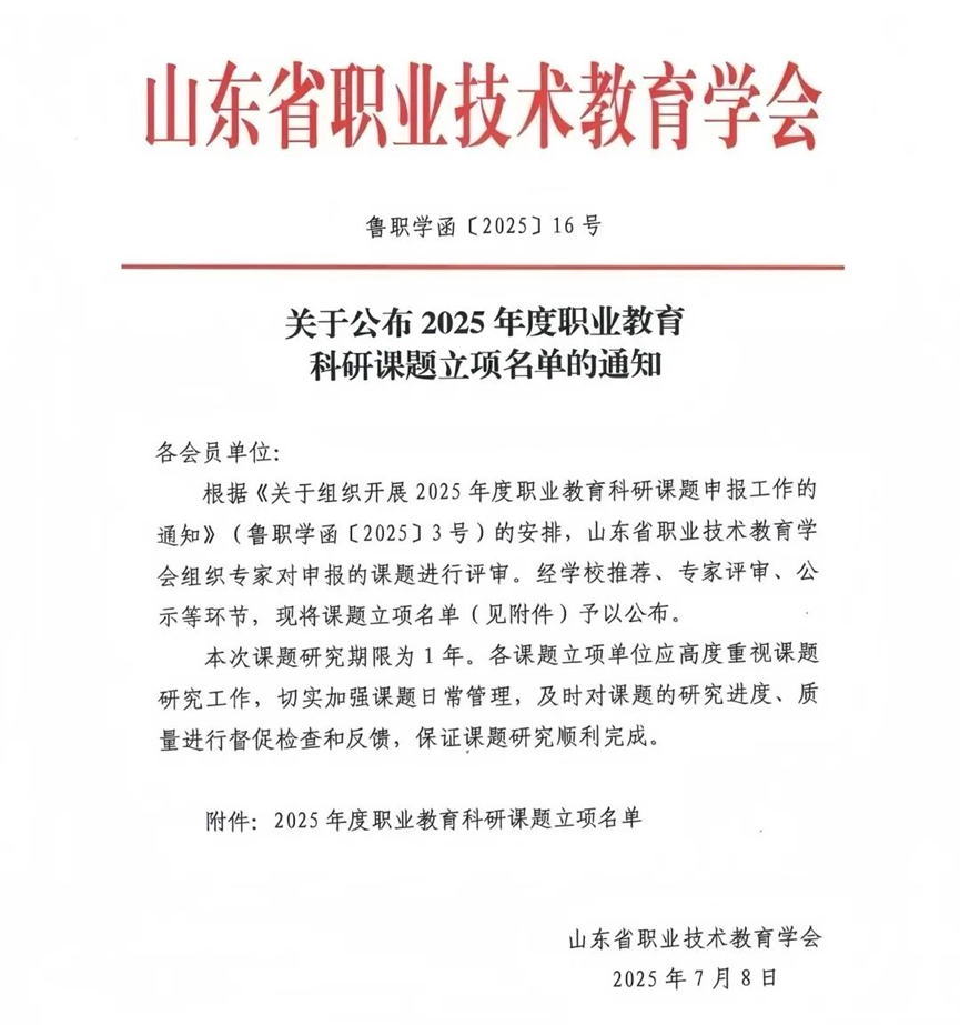 今年以来,我校智能制造专业群获批省级高水平专业群建设项目。立项山东省职业院校教学改革项目2项、山东省社科联青年重点项目1项、山东省职教学会课题3项、山东省职业院校“思政课程与课程思政”专项教学改革研究课题2项、山东省人工智能赋能教育教学应用研究课题2项、滨州市社科规划课题3项。结题山东省高等教育人才研究会民办高等教育人才专业委员会课题9项、滨州市社会科学规划课题5项。开设在线开放课程20门,开发校本教材11部。获得“一带一路”金砖国家技能发展与技术创新大赛国家级技能大赛三等奖2项,第十七届山东省职业院校技能大赛三等奖3项,山东省“技能兴鲁”职业技能大赛一等奖2项、二等奖3项、三等奖7项,滨州市第五届渤海职业技能大赛一等奖1项,二等奖5项,三等奖15项。获第十二届“学创杯”全国大学生创业综合模拟大赛山东省赛二等奖1项,三等奖1项,获第二届中国国际大学生创新大赛山东省赛铜奖1项,获第六届山东省大学生创新方法大赛二等奖1项、三等奖9项,获滨州市黄炎培职业教育创新创业大赛二等奖2项、三等奖3项。