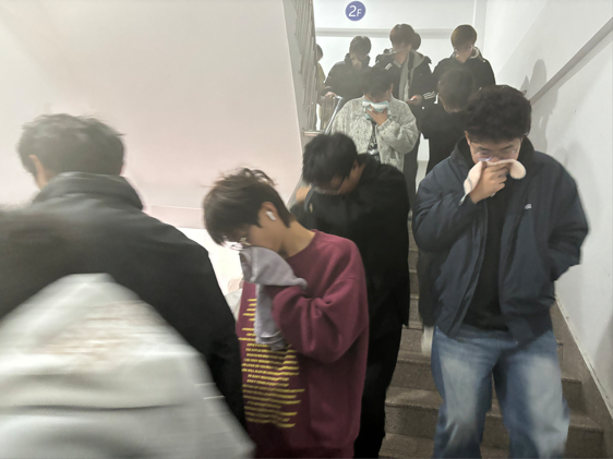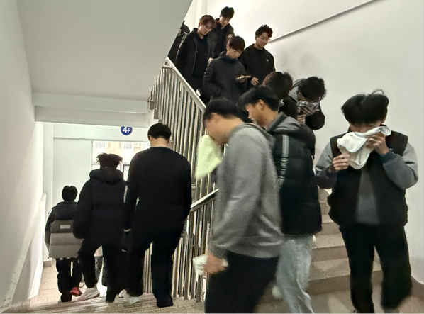 同学们在辅导员及学生干部的引导下,严格遵循“弯腰低姿、捂鼻护颈、靠右行进”的疏散规范,按照预定路线快速有序向室外安全区域撤离。整个疏散过程紧张有序、衔接顺畅,疏散环节高效完成。