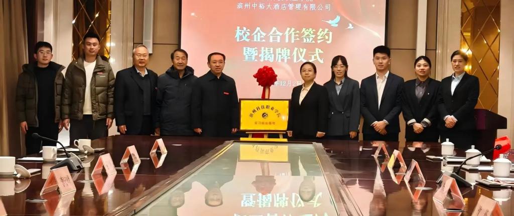 12月2日,滨州科技职业学院与滨州中裕大酒店管理有限公司实习就业基地签约暨挂牌仪式在滨州中裕大酒店隆重举行。我校执行校长孙才顺,现代服务业学院院长张道祥,实习就业中心主任李守峰,现代服务业学院党总支书记、副院长张树亮,实习就业负责人程志伟;滨州中裕集团副总侯恩娟,人力主任訾鑫田、沈菲,餐饮总监张晓娜,中裕大酒店负责人闫芬等双方代表出席仪式,共同开启产教融合协同育人新篇章。