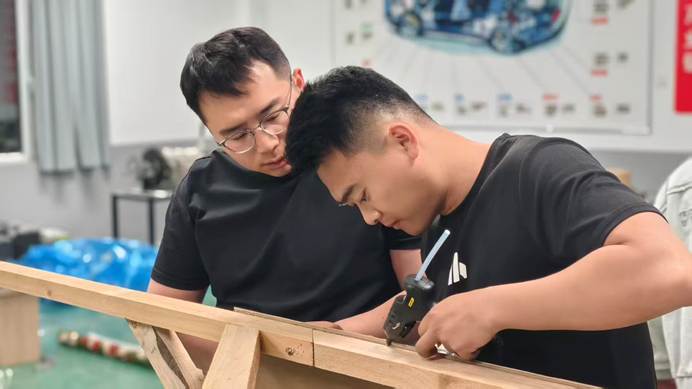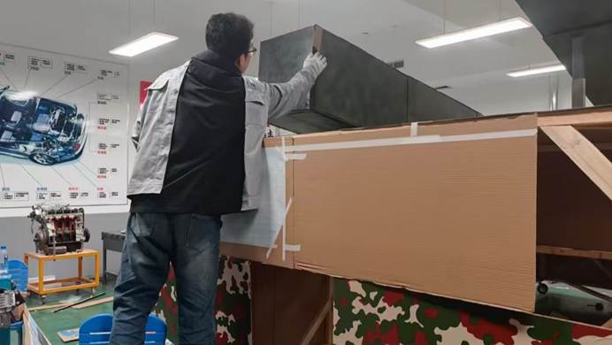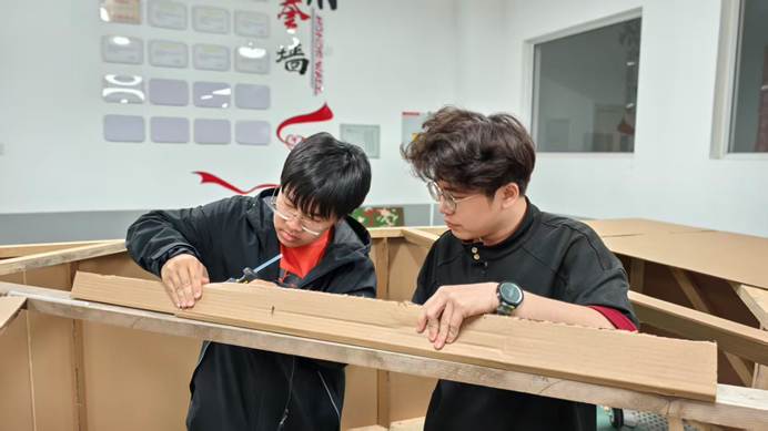 从最初的结构设计、纸板裁切,到框架搭建、部件组装,再到迷彩涂装、细节优化,每一道工序都凝聚着团队的智慧与汗水。师生们以“零误差”为目标,反复打磨、不断调试,将课堂所学的专业原理知识转化为实践成果,用纸板与螺丝钉搭建起“长征-90”的整体形态,用迷彩涂装赋予模型独特的视觉表达。