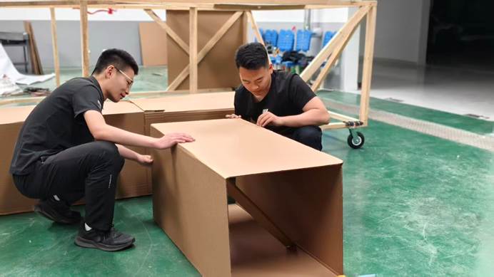 模型制作过程中,师生们以专业为笔、以匠心为墨,开启了一场从图纸到实体的匠心之旅。制作现场,师生们分工协作、默契配合:有的手持工具细致切割纸板,精准勾勒模型轮廓;有的凝神聚力拼接部件,反复调整每一处细节的角度与契合度;有的专注粘贴迷彩涂装材料,耐心还原装备的外观质感;有的仔细固定螺丝钉配件,确保结构稳固牢靠。一张张专注的脸庞、一次次严谨的打磨,尽显智能制造学院师生扎实的动手实践能力与严谨细致的专业态度。