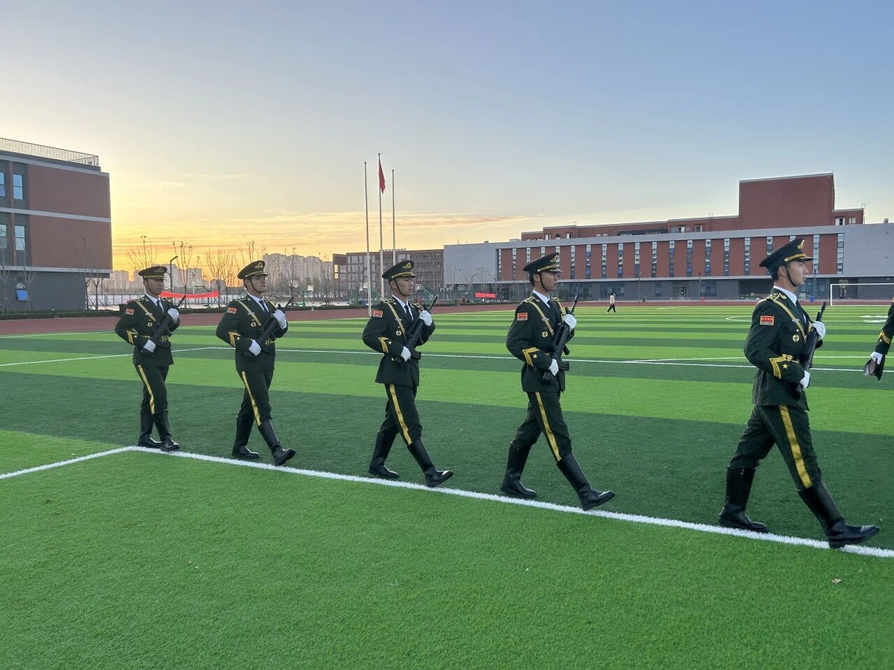 仪式进行第一项,升国旗,奏唱国歌!在激昂的国歌声中,国旗徐徐升起。这一刻,操场上弥漫着庄严的氛围,每个人的心中都充满了对祖国的热爱和敬仰。国旗在风中飘扬,激励着师生们在新的征程中奋勇前行。