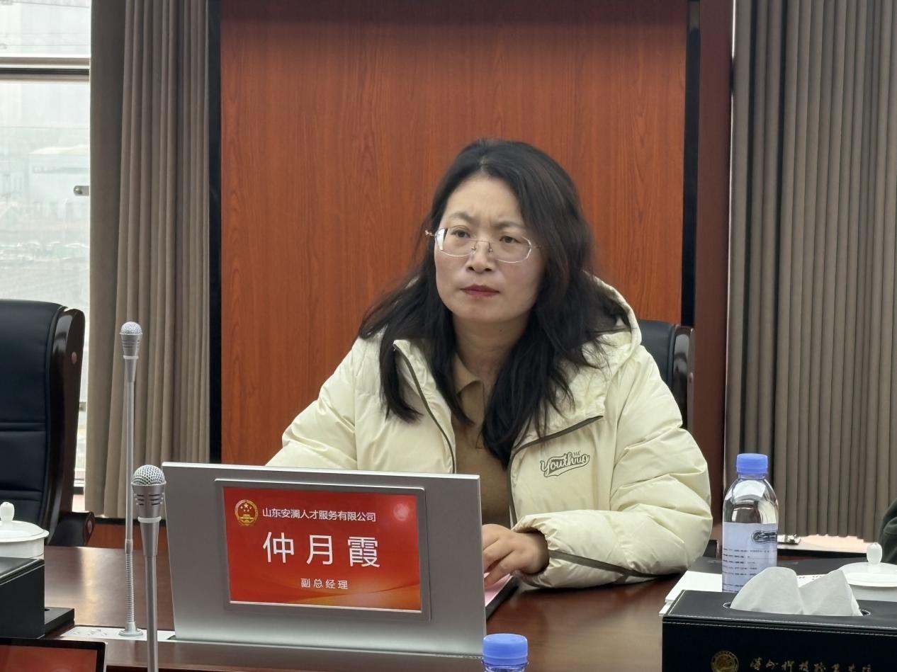 仲月霞介绍了企业发展布局与业务板块。山东安澜人才服务有限公司作为一家国企,业务覆盖学前教育、国际劳务、无人机培训、全品类职业培训、人力资源服务、教育服务等领域,致力于为全年龄段人群提供综合性教育与人才服务。她表示,希望与学校进一步深化交流合作,实现信息互通、资源共享,共同推动校企协同发展。